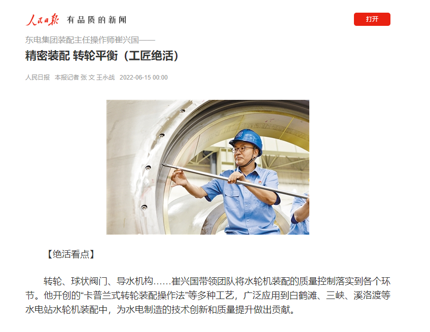 追求产品品质与效率,崔兴国还开创了“卡普兰式转轮装配操作法”等多种工艺,普遍应用到白鹤滩、三峡、溪洛渡等特大型水电站水轮机装配中,为水电制造的手艺立异和质量提升做出孝顺。“只有通过手艺水平的提高制造出更高质量的产品,才华为社会创立价值。”在崔兴国看来,从事制造业就意味着要一直提升手艺水平,追求更高的标准。