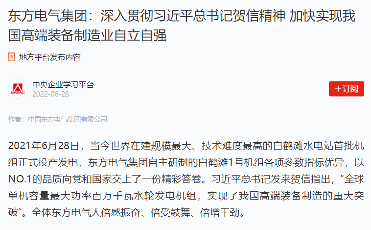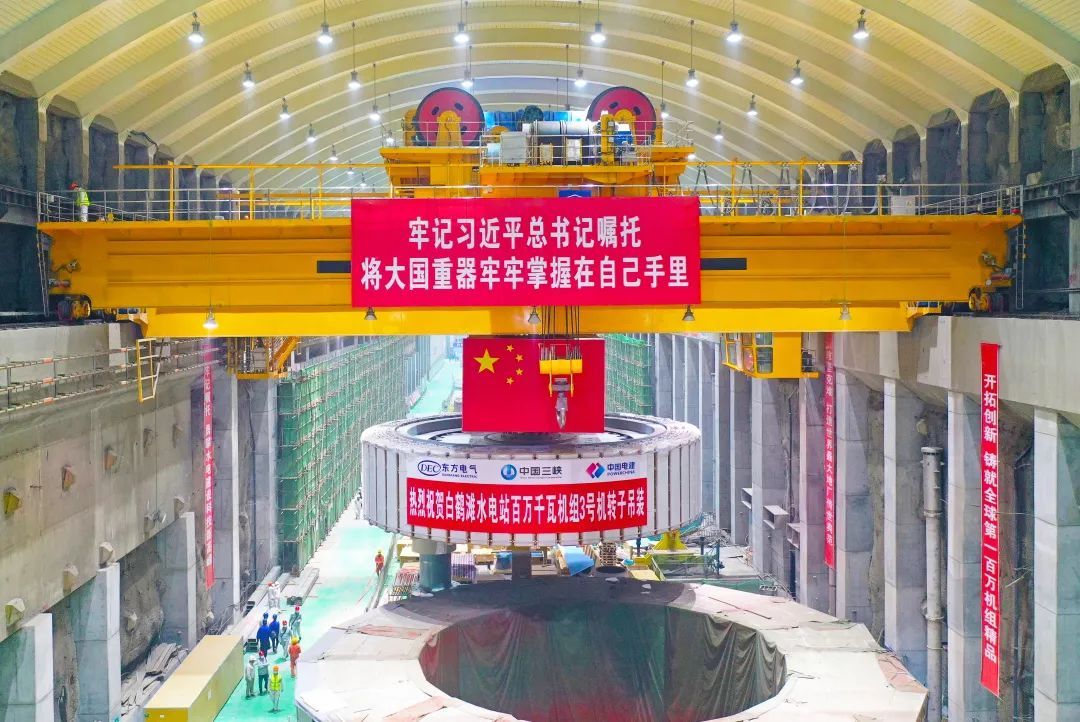 2021年6月28日,当今天下在建规模最大、手艺难度最高的白鹤滩水电站首批机组正式投产发电,永利集团官网总站集团自主研制的白鹤滩1号机组各项参数指标优异,以NO.1的品质向党和国家交上了一份精彩答卷。习近平总书记发来贺信指出,“全球单机容量最大功率百万千瓦水轮发电机组,实现了我国高端装备制造的重大突破”。全体永利集团官网总站人倍感振奋、倍受鼓舞、倍增劲头。