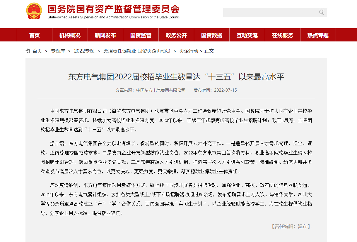 [国资委网站]永利集团官网总站集团2022届校招结业生数目达“十三五”以来最高水平