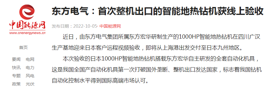 ±¾´ÎÑéÊÕµÄÈÕ±¾1000HPÖÇÄܵØÈÈ×ê»ú´îÔØ¶«·½ºê»ª×ÔÖ÷Ñз¢µÄÈ«Ì××Ô¶¯»¯»ú¾ß£¬ÕâÊÇÎÒ¹úÌìϲú×Ô¶¯»¯»ú¾ßµÚÒ»´ÎÍ»ÆÆÍâÑó¢¶Ï¡¢Õû»ú³ö¿ÚÅ¹ú¼Ò£¬±ê¼Ç×ÅÎÒ¹ú×ê»ú×Ô¶¯»¯¿ØÖÆË®Æ½»ñµÃ¹ú¼Ê¸ß¶ËÊг¡ÈϿɡ£