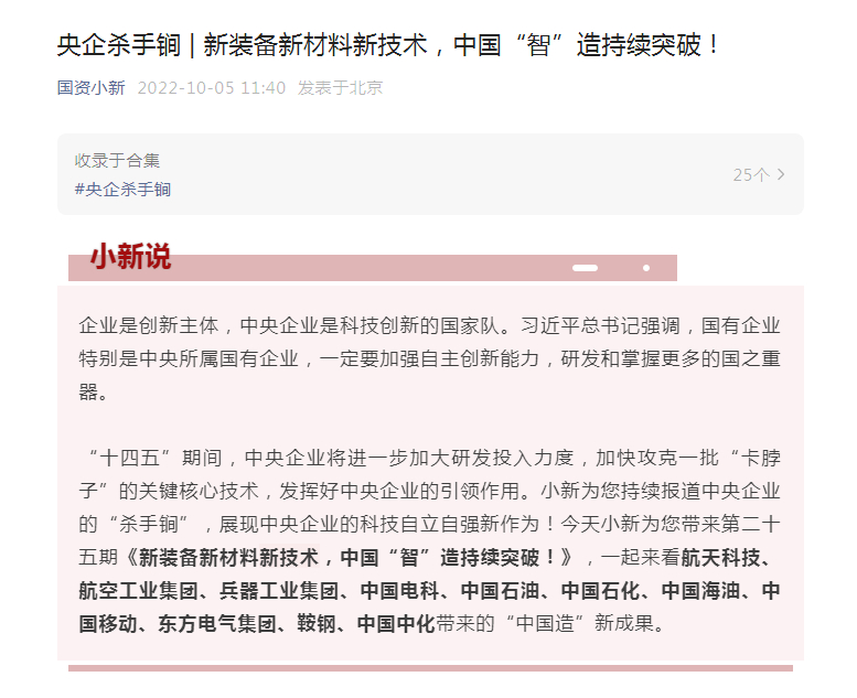 [国资小新]央企杀手锏 | 新装备新质料新手艺,中国“智”造一连突破!