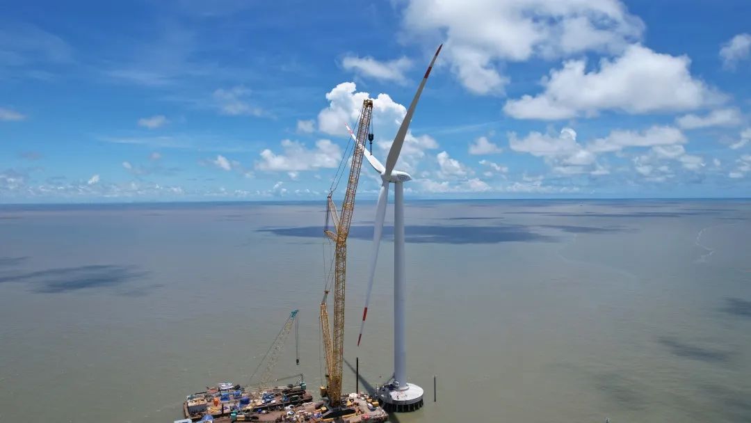 在一望无垠的越南槟椥省海域,为阻止东北季风滋扰,中越建设者们正紧抓窗口期,举行风机吊装。随着最后一台直径155米、重量105吨的风轮与发电机严密对接,越南长海4期海优势电项目7台机组所有吊装完毕。