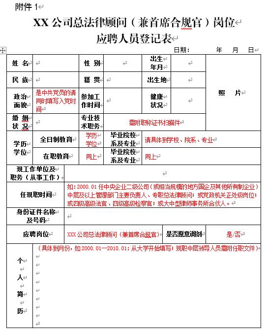 XX公司总执法照料(兼首席合规官)岗位应聘职员挂号表