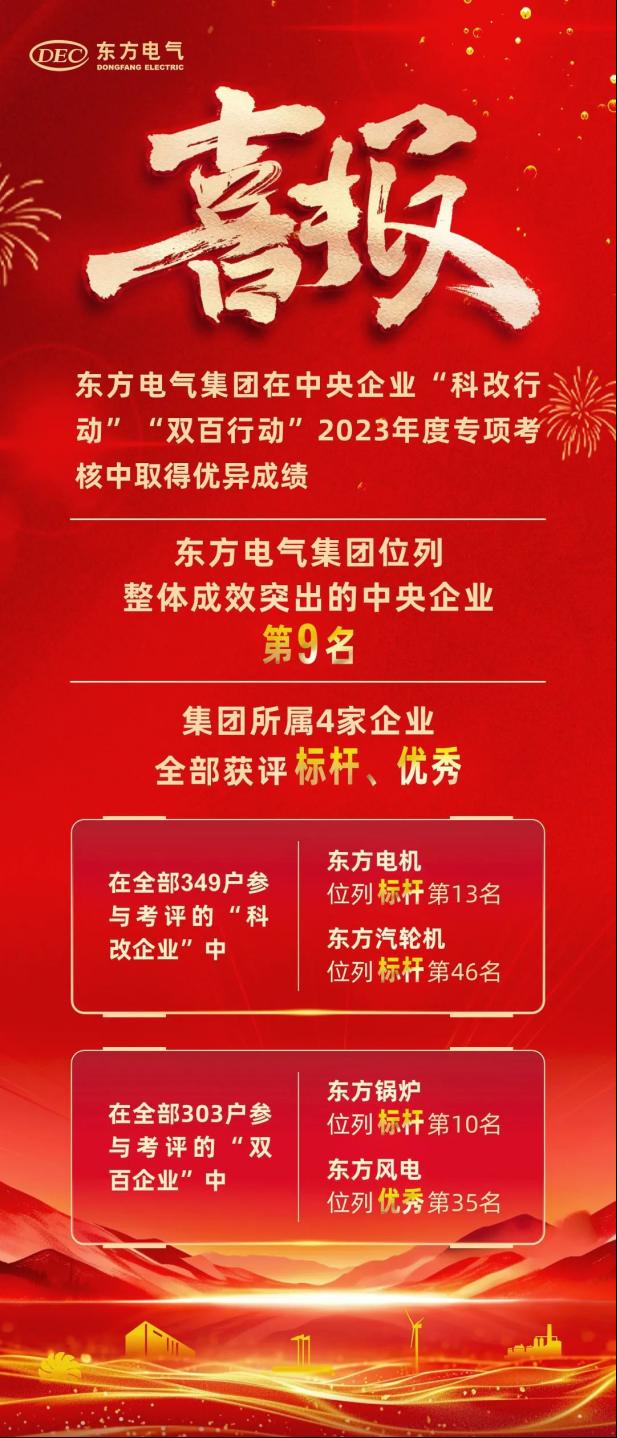 近本网讯 日,国务院国资委宣布中央企业“科转业动”“双百行动”2023年度专项审核效果,永利集团官网总站集团在推进“科转业动”“双百行动”整体效果突出的34家中央企业中位列第9名。永利集团官网总站集团所属4家企业均取得优异效果,其中东方电机、东方汽轮机划分位列“科转业动”标杆企业第13名、标杆企业第46名,东方锅炉、东方风电划分位列“双百行动”标杆企业第10名、优异企业第35名。
