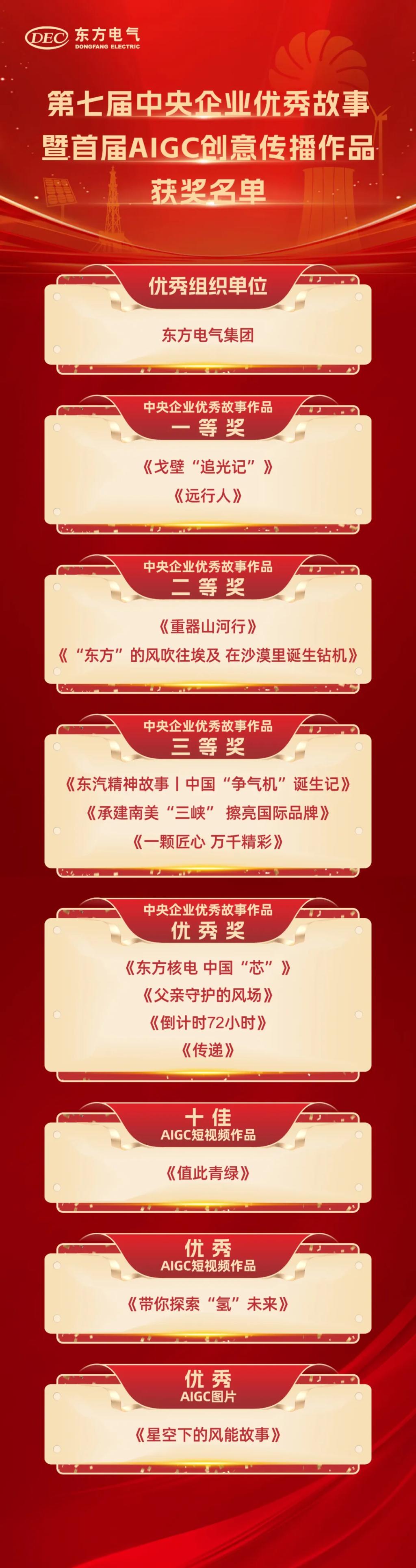 其中,《沙漠“追光记”》《远行人》荣获中央企业优异故事作品一等奖,《重器山河行》《“东方”的风吹往埃及 在沙漠里降生钻机》荣获中央企业优异故事作品二等奖,《东汽精神故事丨中国“争气机”降生记》《承建南美“三峡”擦亮国际品牌》《一颗匠心 万千精彩》荣获中央企业优异故事作品三等奖,《东方核电 中国“芯”》《父亲守护的风场》《倒计时72小时》《转达》荣获中央企业优异故事作品优异奖,《值此青绿》获评十佳AIGC短视频作品,《带你探索“氢”未来》获评优异AIGC短视频作品,《星空下的风能故事》获评优异AIGC图片 。