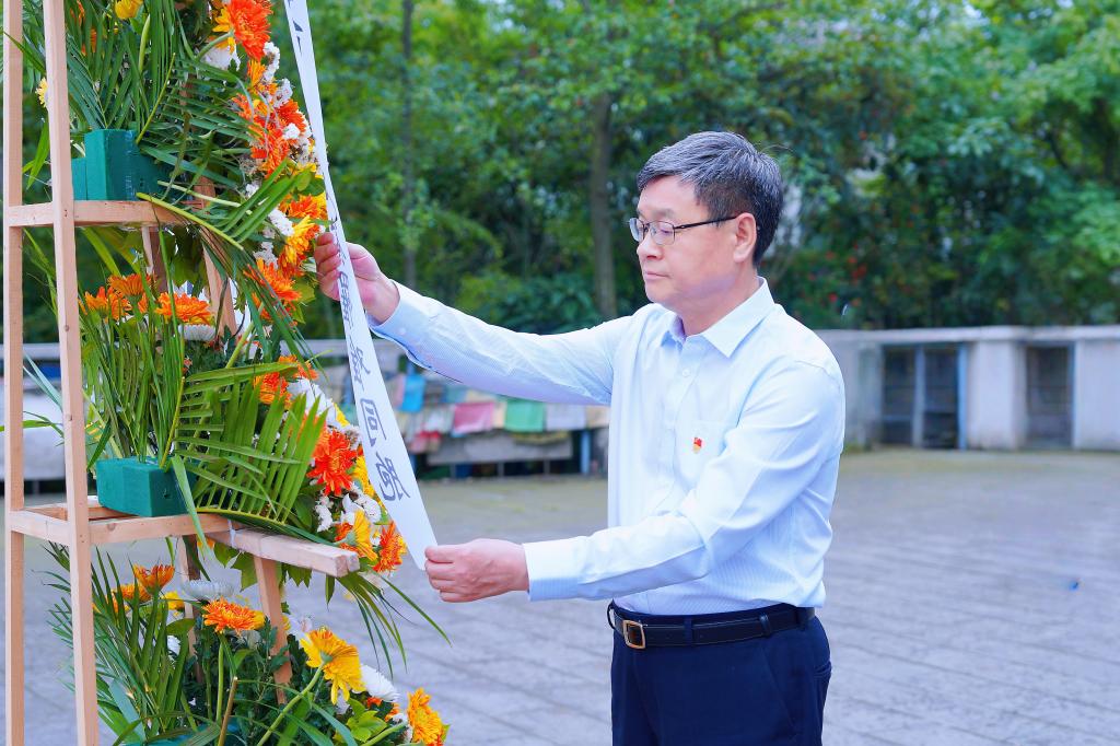 在汉旺公墓,罗乾宜向在“5·12”汶川特大地动中罹难同胞悲哀思念、敬献花篮。