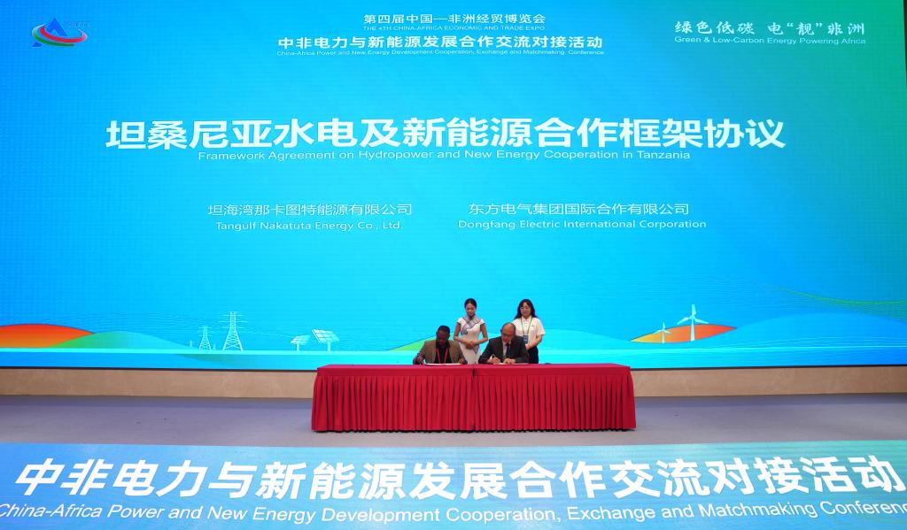 在效果宣布及项目签约环节,东方国际与坦桑尼亚Tangulf Nakatuta Energy Company Limited(TANECO)公司签署《坦桑尼亚水电及新能源合作框架协议》,双方将施展各自行业优势,助力非洲能源绿色升级。